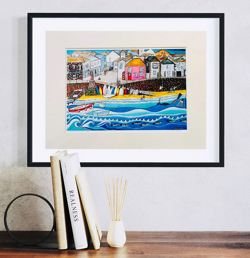 Her unique, bold, colourful naive style makes her art a joyous interpretation to be viewed. The ‘Happy Holidays’ Collection are bright, uplifting and colourful representations of some of the local landscapes of Cornish towns and popular destinations and her artworks are particularly popular with the holiday makers.